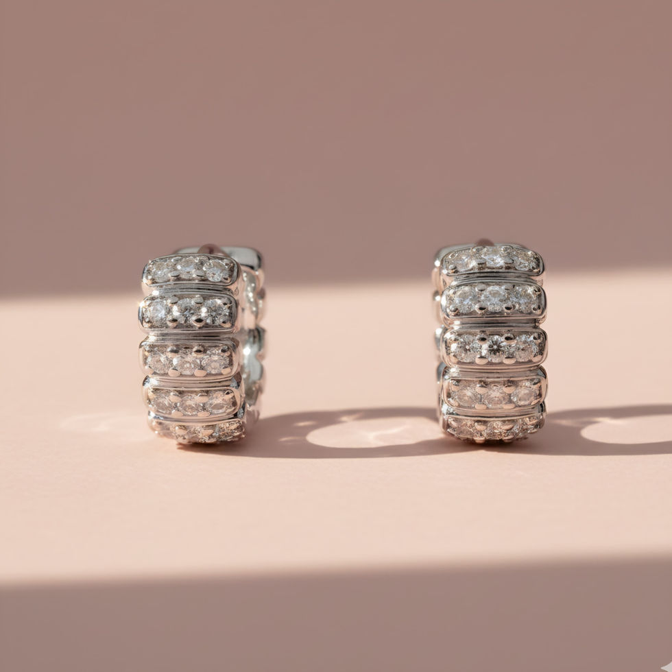 These Earrings reimagine the classic silhouette with a luxurious twist — each rounded “bubble” block is pavé set with shimmering stones, creating a radiant texture that sparkles with every movement. The sculptural, bubble-like forms flow smoothly around the hoop, blending playful curves with refined brilliance. Their intricate pavé detailing adds depth and sophistication, while the polished finish enhances the light-catching allure. Modern yet timeless, these hoops offer the perfect balance of fun and glamour, ideal for day-to-night elegance.