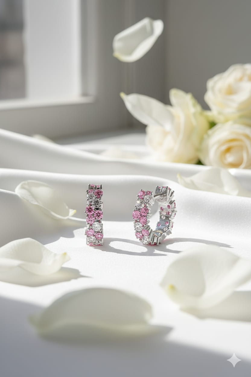 These charming hoop earrings features pink and white stones set in a seemingly random, natural pattern. With more pink stones than white, the design evokes delicate petals scattered across a floral landscape, creating a lively and feminine sparkle with every movement. The rounded hoop shape frames the arrangement beautifully, offering a playful yet sophisticated statement that captures the romance and joy of blooming flowers, perfect for both everyday elegance and special occasions.