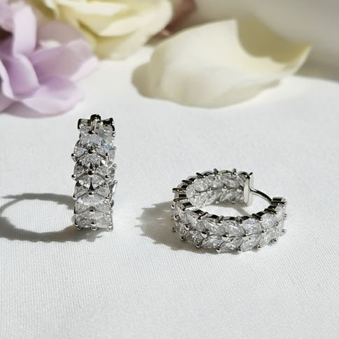 These elegant huggie earrings feature a striking braid motif formed entirely from marquise-shaped stones, creating a sculptural, interwoven effect that exudes sophistication. The marquise stones are meticulously set along the front and continue around the inner circumference, ensuring sparkle from every angle. The combination of the fluid braided design with the elongated brilliance of the marquise cuts gives these huggies a contemporary yet timeless appeal, perfect for layering or wearing as a standout statement piece.