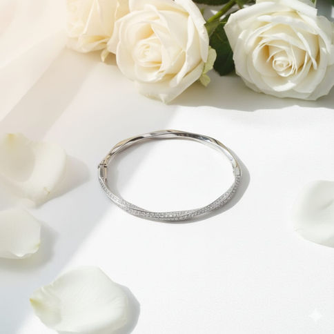This elegant twist bangle features a sophisticated design where one half is sleek and polished, while the other half is pavé-set with sparkling stones. The contrasting finishes create a dynamic interplay of light and texture, making the piece both modern and versatile. Its fluid, twisted silhouette gracefully hugs the wrist, offering a chic statement that balances understated elegance with refined sparkle, perfect for layering or wearing alone as a signature piece.