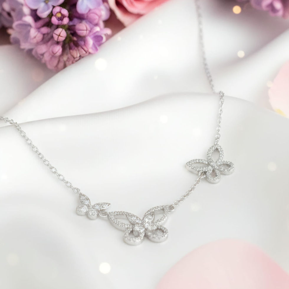 The 3 Mariposa Necklace unfolds in a graceful vertical cascade of butterflies, each distinct yet seamlessly connected. At the top sits the smallest butterfly, shimmering with pavé-set stones that give it a soft, delicate sparkle. It links to the largest butterfly, a sculpted and luminous centerpiece that anchors the design. From this main butterfly, a fine chain extends upward along the neckline to a medium-sized butterfly crafted in an airy outline silhouette, its curves traced with pavé stones for a gentle, glowing finish. The trio forms a floating, layered arrangement that feels as if the butterflies are drifting upward in a quiet breeze, creating a look that’s whimsical, feminine, and subtly enchanting.