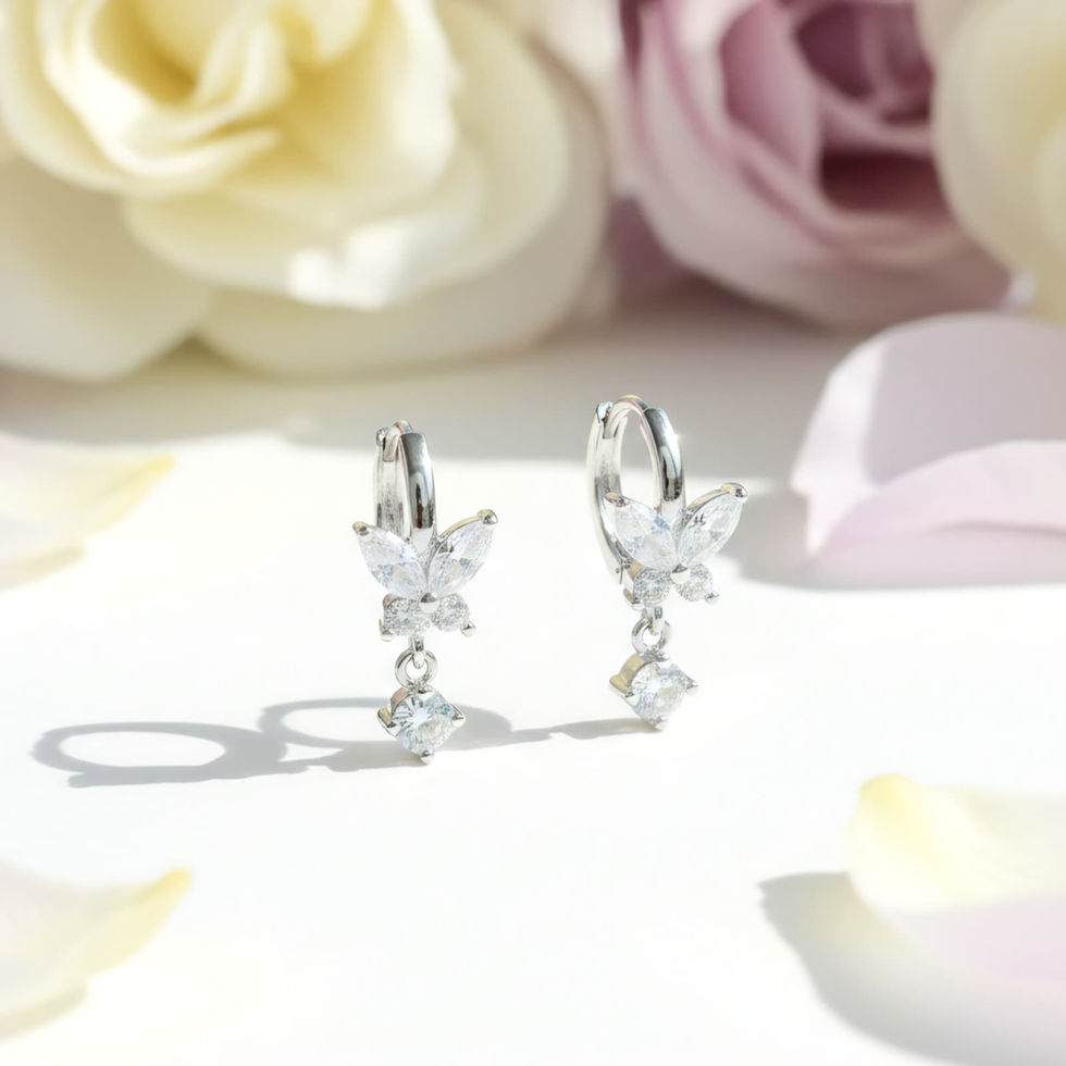 Each earring features a delicate butterfly motif hugging the ear, with the top wings set in sleek marquise-cut stones that create an elegant, elongated sparkle, while the bottom wings are adorned with round stones for soft brilliance and balance. Suspended just below the butterfly, a single drop stone dangles gracefully, adding movement and light-catching shimmer that enhances the feminine, whimsical design.